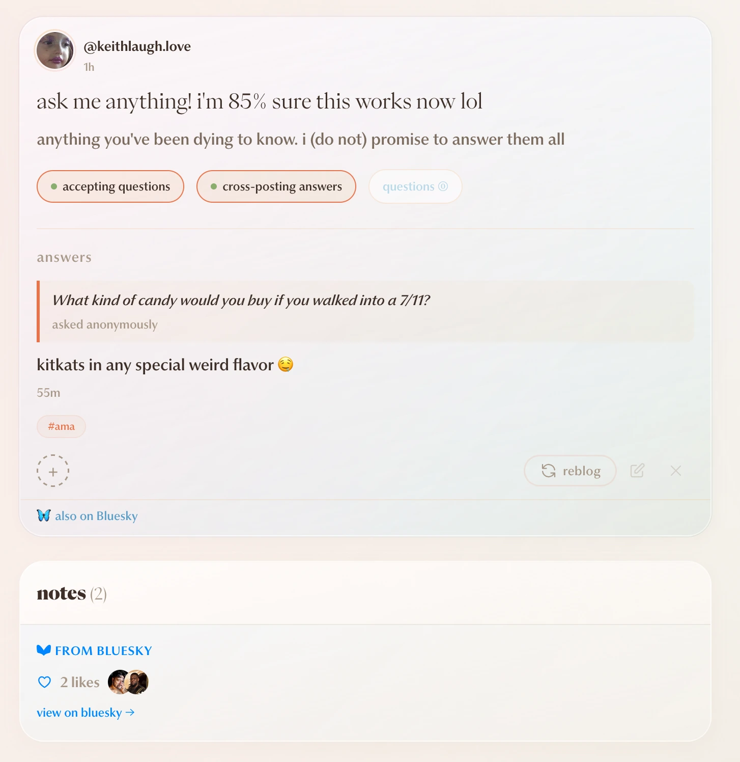pollen just got an AMA feature, and it works differently from everything else on the site. everything else — posts, reblogs, follows, reactions — is written directly to your PDS. public data, owned by you, synced across the network. the AMA post itself works this way too: place.pollen.post.ama is a record on your PDS like any other post.